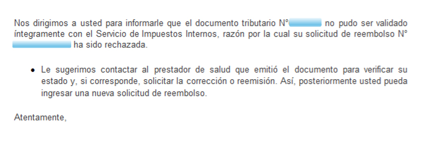 A continuación, hacemos referencia al texto enviado a algunos de sus pacientes afiliados a esta Isapre, ante la información proporcionada por el Servicio de Impuestos Internos una vez efectuada la validación de la documentación tributaria:
